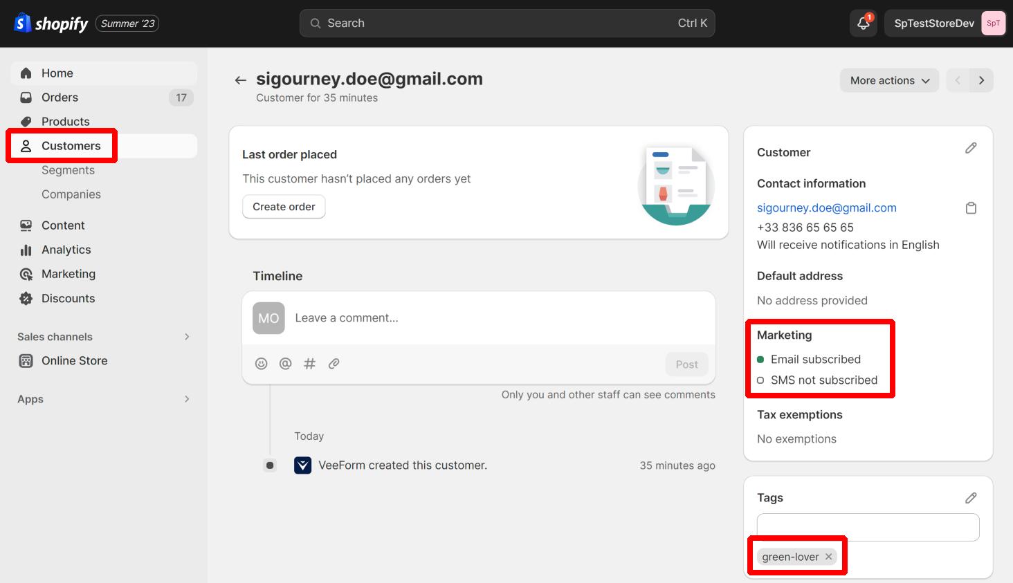 On the screenshot below, you can see the result once “[email protected]” has anwered the quiz : she has been added to my “Customers” list with the tag “green-lover” (as she said that green was his favorite color), a “Subscribed” email marketing status and a “Not subscribed” SMS marketing status.